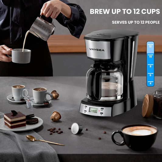 VAVSEA 12 Cup Programmable Coffee Maker, 900W Drip Coffeemaker with Glass Carafe, Auto Shut off, for Home Black