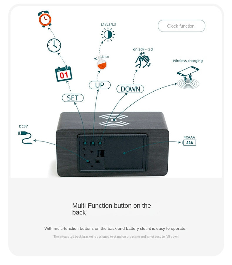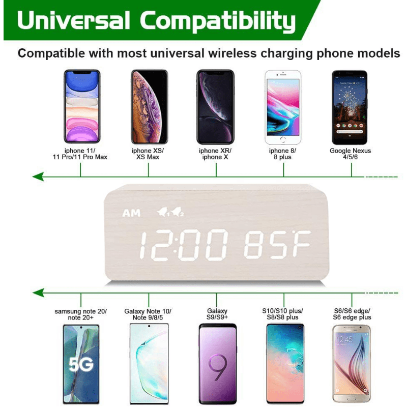 Digital Wooden Alarm Clock With Wireless Charging For Phone, 0-100% Dimmer, Dual Alarm, Weekend Mode, Snooze, Wood LED Clocks For Bedroom, Bedside, Desk