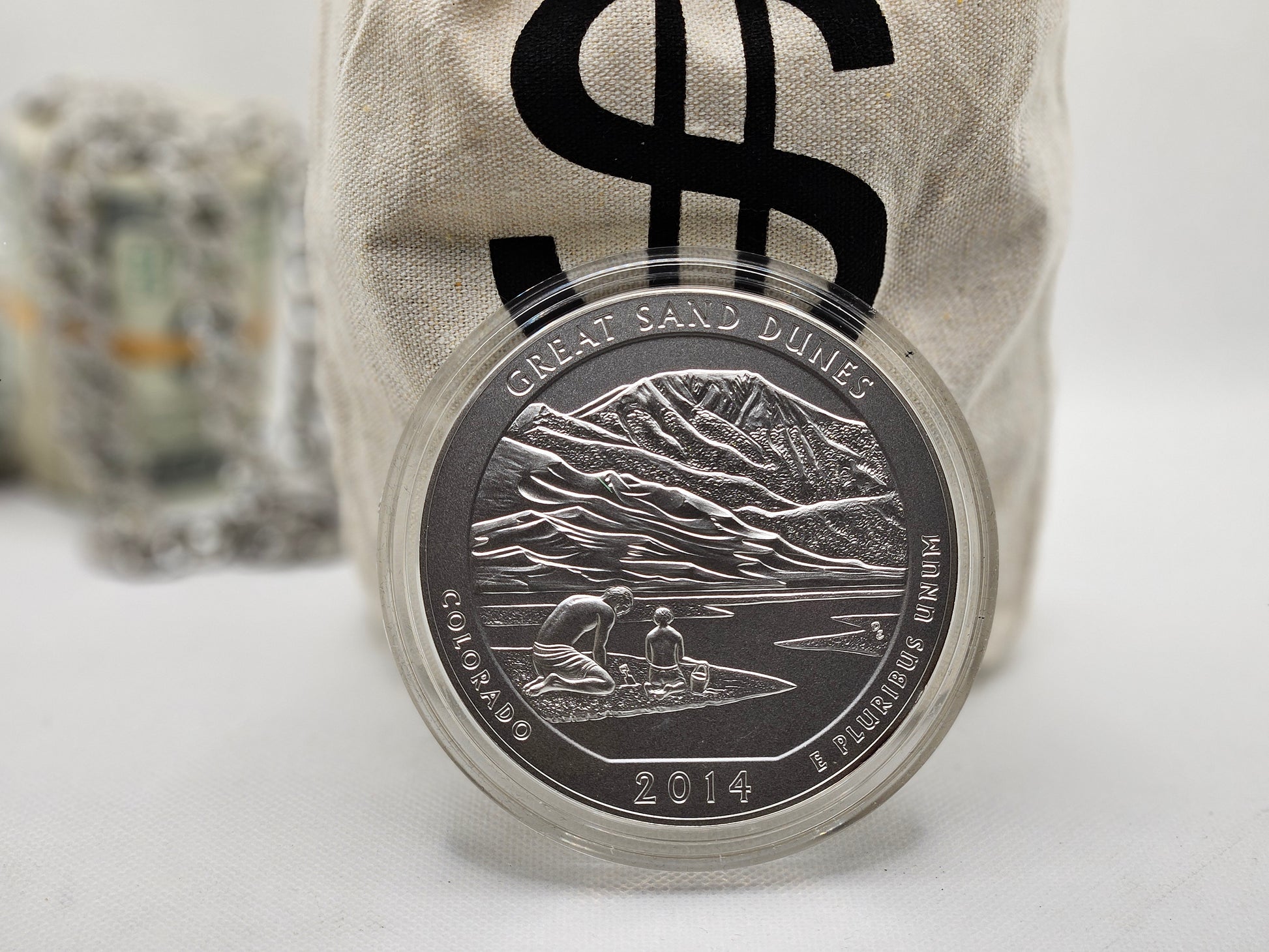 The product is a 2014 Silver 5 oz Coin ATB with Capsule featuring the Great Sand Dunes of Colorado as part of the America the Beautiful series. Minted by the U.S. Mint, this coin is made of 0.999 fine silver and contains 5 oz of precious metal content. The coin is ungraded and includes a capsule for protection. This special coin pays tribute to the unique geological features of Colorado's Great Sand Dunes.